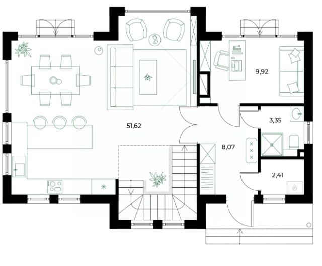1-й этаж: просторная кухня-гостиная с панорамными окнами, санузел, бойлерная. Есть возможность сделать доп.спальню.