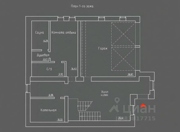 1-й этаж: прихожая/бойлерная, кухня, гостиная, кабинет, санузел