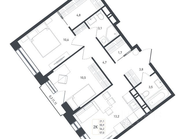Квартира находится в современном монолитно-кирпичном доме 2022 года постройки, который отличается высоким качеством строительства и надёжностью конструкции. Квартира расположена на втором этаже шестиэтажного дома, что обеспечивает удобный доступ и комфортное проживание. Наличие наземной парковки делает жизнь ещё более удобной. Общая площадь квартиры составляет 57,8 кв. м, из которых 35,3 кв. м — жилая площадь. Две изолированные комнаты (21 кв. м и 14,3 кв. м) идеально подойдут для различных потребностей семьи. Кухня площадью 9 кв. м станет местом для кулинарных экспериментов и семейных ужинов. Высота потолков 2,7 м создаёт ощущение простора и свободы.