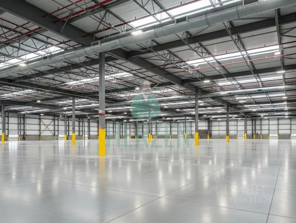Ровный бетонный пол с антипылевым покрытием. Допустимая нагрузка на пол 5 т/м2.