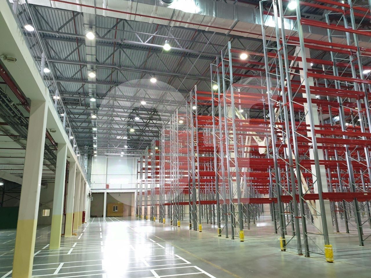 Стеллажи: Да (10 500 мм (верхний ярус стеллажей), до крыши 12 000 мм, входят в стоимость, 9 526 п/м, 6 ярусов)