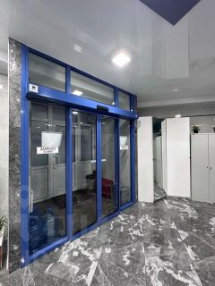 Высокие потолки, витринные окна, раздвижные сенсорные двери при входе.
