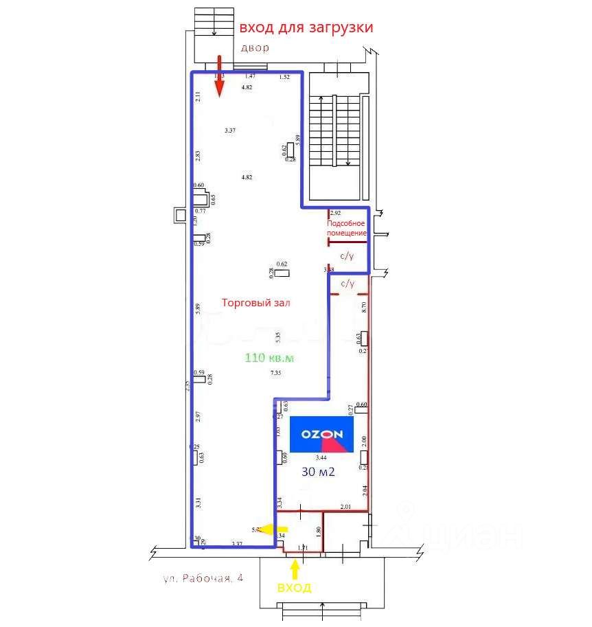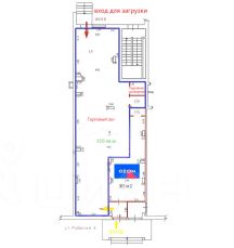 Входная группа: вход с улице, общий с Озоном. 2 вход - зона разгрузки со двора.