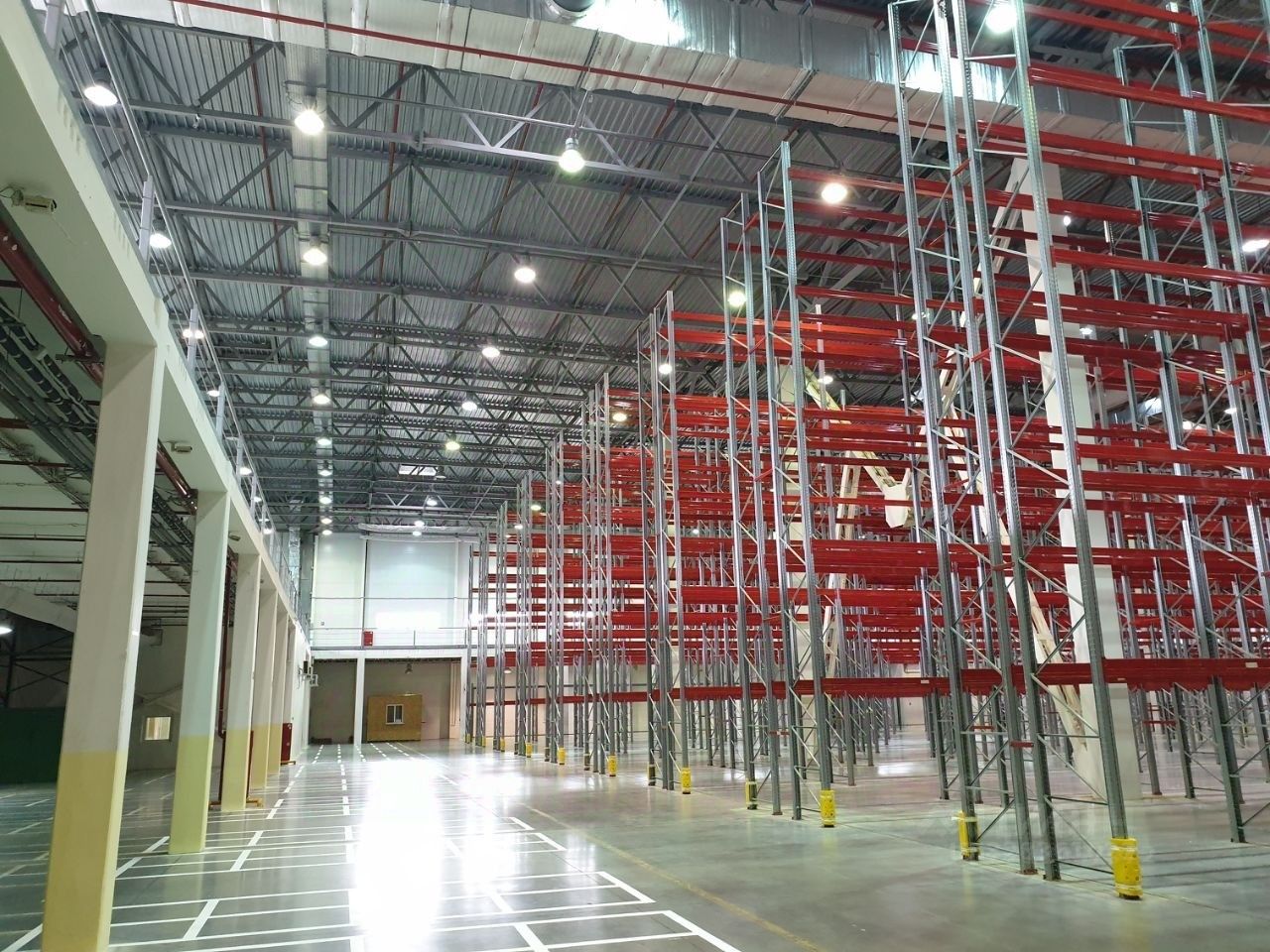 Площадь склада: 7016м2 (установлены стеллажи на 9526 паллетомест, входят в арендную плату)