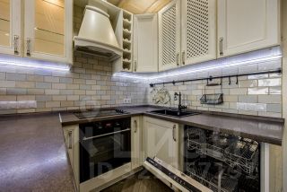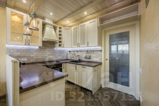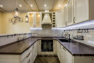 Интерьер выполнен в стиле Прованс, кухня с использованием итальянской плитки под дерево на полу и виницианской штукатуркой на стенах, на потолке натуральное дерево. Кухонная мебель из массива ясеня создает атмосферу утонченности и элегантности. Кухня оснащена дополнительными встроенными морозильными камерами)