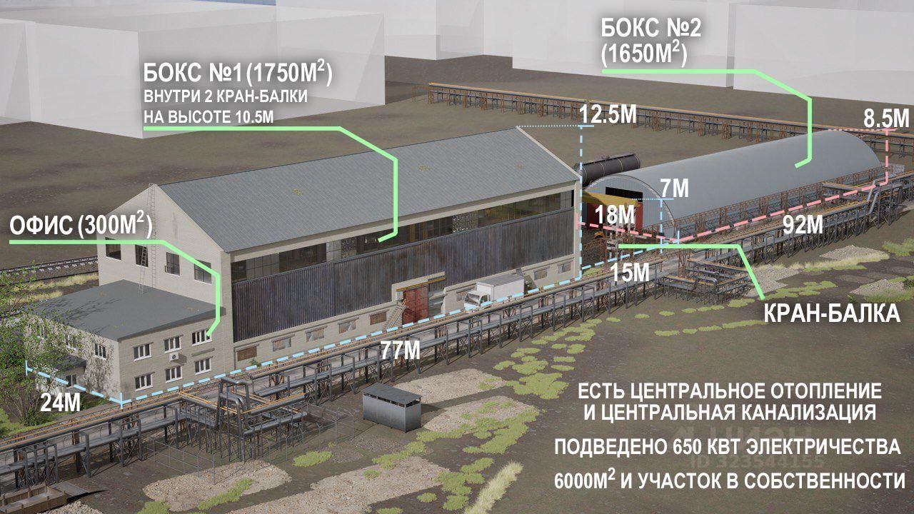 •    1 производственный отапливаемый корпус площадью 1700 м2. Размер