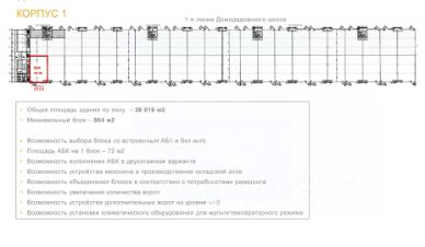Рабочая высота 8 м Шаг колон 12 х 24 Полы антипыль Нагрузка на пол 6 т./ кв. м. Уровень пола 1,1 м Усиленная кровля - Технониколь (возможность установки климатического и вентиляционного оборудования на кровле) Доковые ворота - Hоrmann c герметизаторами и уравнительными платформами. ИНЖЕНЕРНЫЕ И ИНФРАСТРУКТУРНЫЕ РЕШЕНИЯ: Подключение электрической мощности Возможность установки климатического оборудования для мультитемпературного склада Система водоотведения увеличенного диаметра (d600) и локальные очистные сооружения Возможность подключения газа Техническая возможность дооснащения дополнительными воротами, нулевыми воротами и внешним пандусом Возможность организации встроенных помещений административно-бытового назначения. Парковка для легковых и грузовых автомобилей. БЦ на территории с офисами и кафе-столовой. Склад готов для новых резидентов!