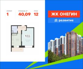 Продается квартира площадью 40.09 кв. м с отделкой white box на 12 этаже 22 этажного дома. Квартира находится в новом жилом комплексе "Онегин", расположенном по адресу: Московская область, г. Подольск, ул. Садовая 3, корп. 1.