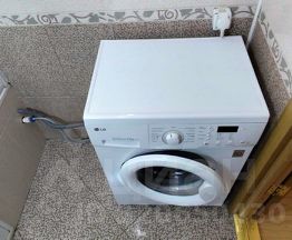 В ванной комнате установлена стиральная машина LG, стеклянная раздвижная перегородка, раковина с тумбой и зеркалом.