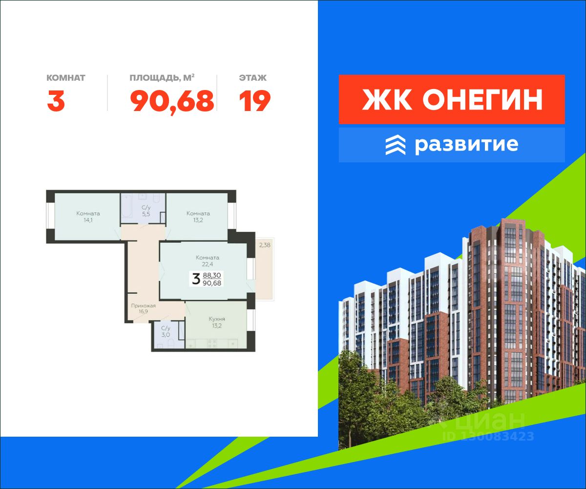 Продается квартира площадью 90.68 кв. м с отделкой white box на 19 этаже 22 этажного дома. Квартира находится в новом жилом комплексе "Онегин", расположенном по адресу: Московская область, г. Подольск, ул. Садовая 3, корп. 1.