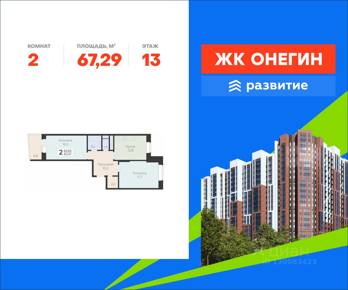 Продается квартира площадью 67.29 кв. м с отделкой white box на 13 этаже 20 этажного дома. Квартира находится в новом жилом комплексе "Онегин", расположенном по адресу: Московская область, г. Подольск, ул. Садовая 3, корп. 1.
