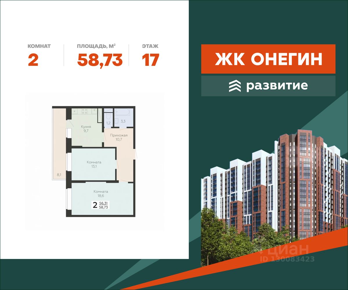 Продается квартира площадью 58.73 кв. м с отделкой white box на 17 этаже 20 этажного дома. Квартира находится в новом жилом комплексе "Онегин", расположенном по адресу: Московская область, г. Подольск, ул. Садовая 3, корп. 1.