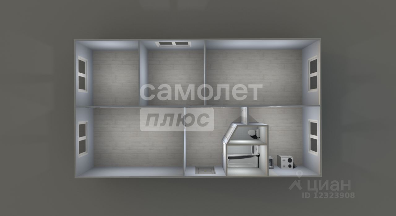 Общая площадь - 58,1 кв. м. Четыре смежно- изолированные комнаты , кухня - 6.4 кв. м., раздельный санузел.