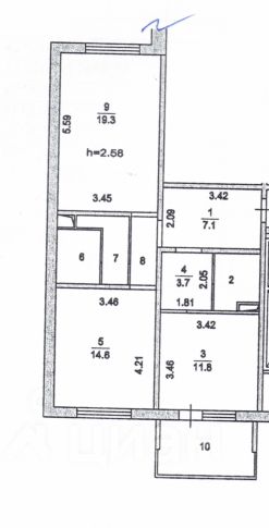 Общая площадь (без учета лоджии) — 67 кв. м, комнаты: 14,6-19,3 кв.м.