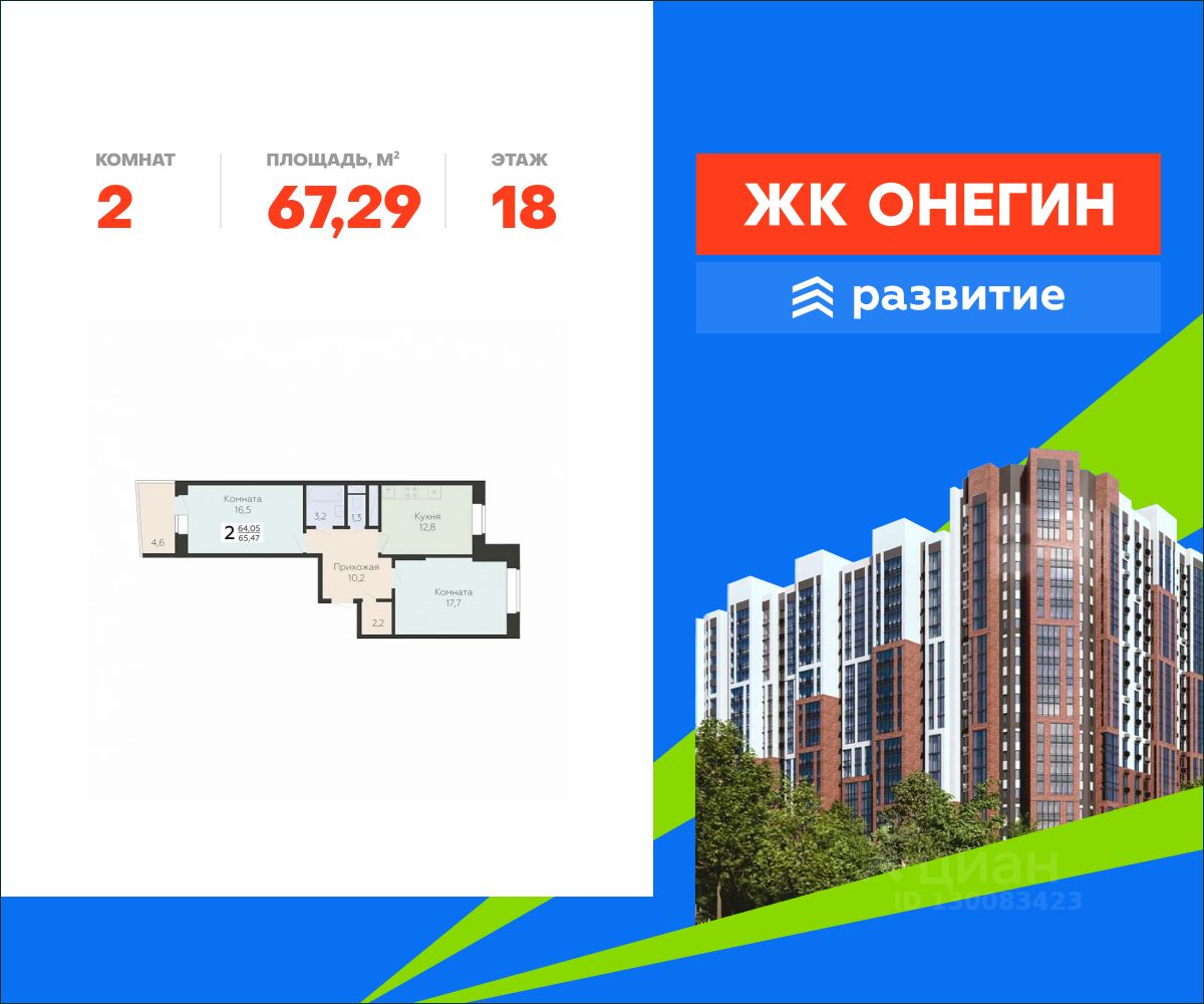 Продается квартира площадью 67.29 кв. м с отделкой white box на 18 этаже 20 этажного дома. Квартира находится в новом жилом комплексе "Онегин", расположенном по адресу: Московская область, г. Подольск, ул. Садовая 3, корп. 1.