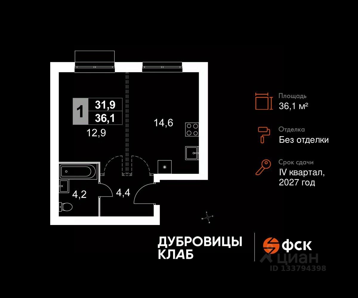 Продаётся 1-к квартира 190 общей площадью 36.1 кв.м на 4-м этаже 4 этажного дома. Без отделки.
