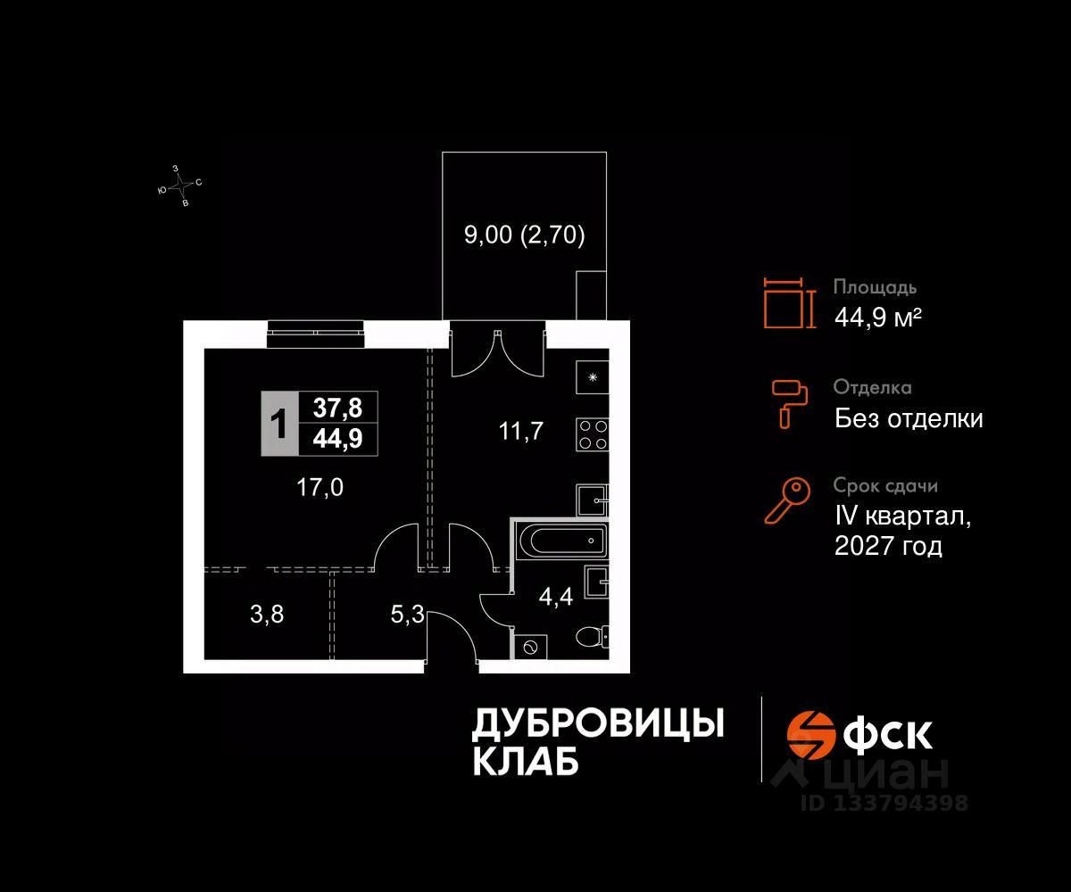 Продаётся 1-к квартира 26 общей площадью 44.9 кв.м на 1-м этаже 4 этажного дома. Без отделки.