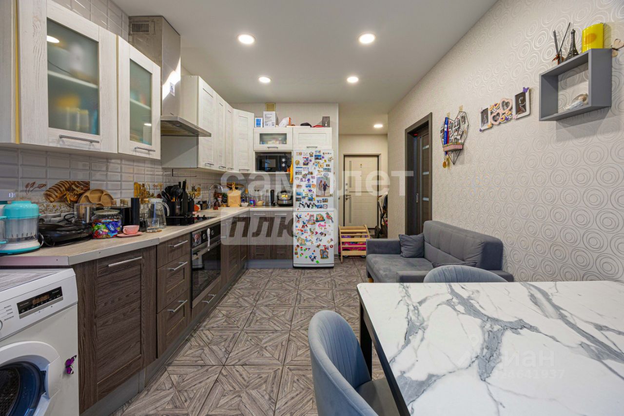 - остается мебель и техника: встроенный кухонный гарнитур, холодильник, электрическая плита, стиральная машинка, стеллаж.