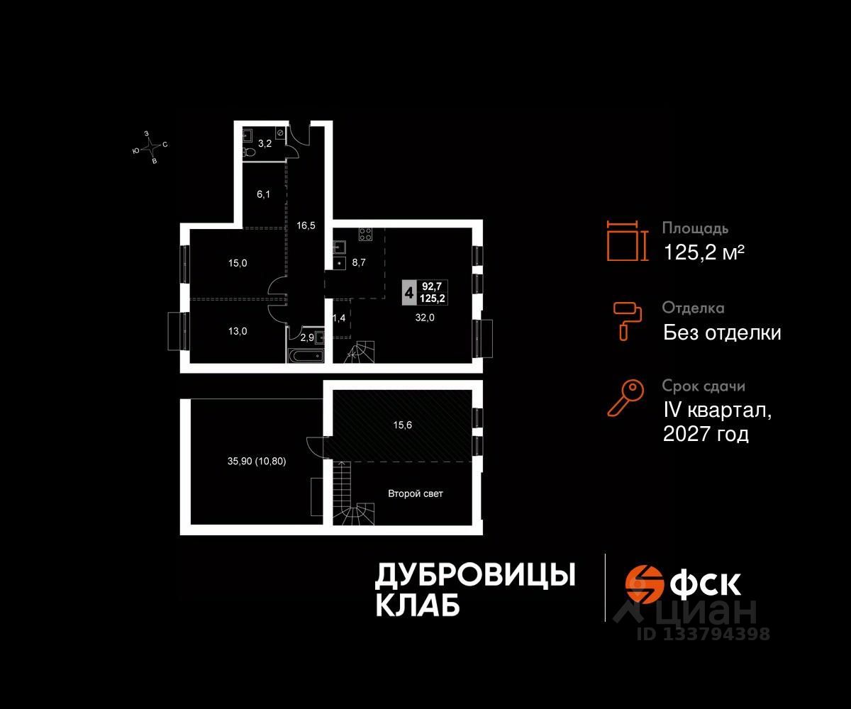 Продаётся 4-к квартира 103 общей площадью 125.2 кв.м на 4-м этаже 4 этажного дома. Без отделки.