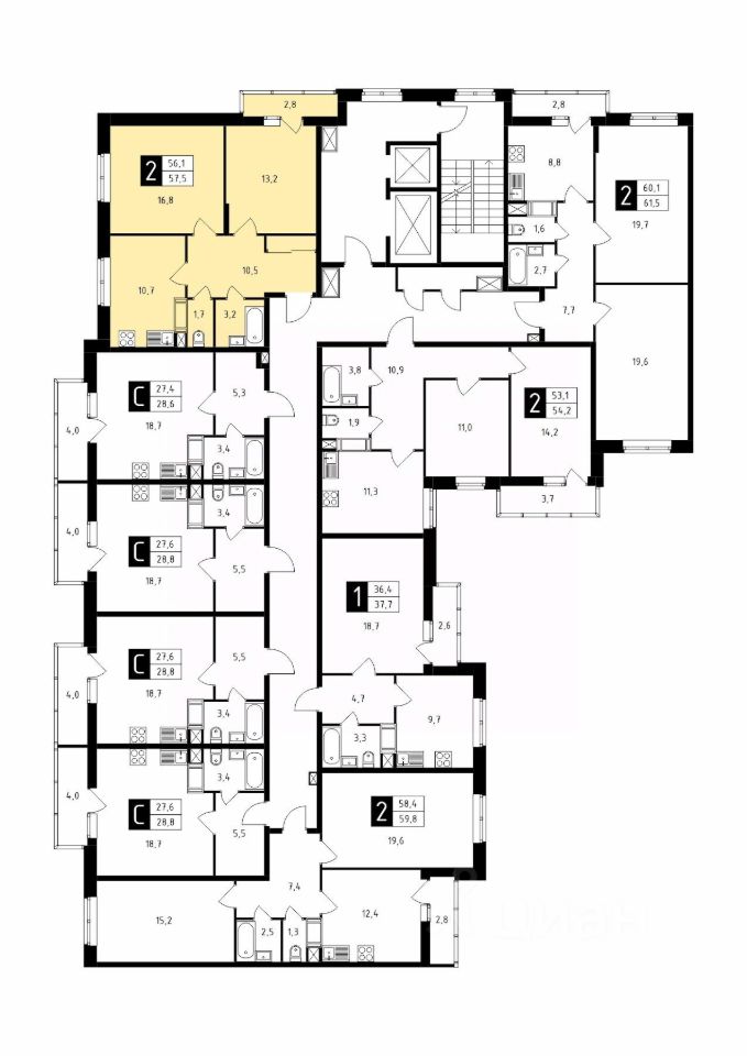 Продаётся 2-комнатная квартира в строящемся доме (Корпус 1), срок сдачи: 1-кв. 2026, общей площадью 57.50 кв.м., на 3 этаже.
