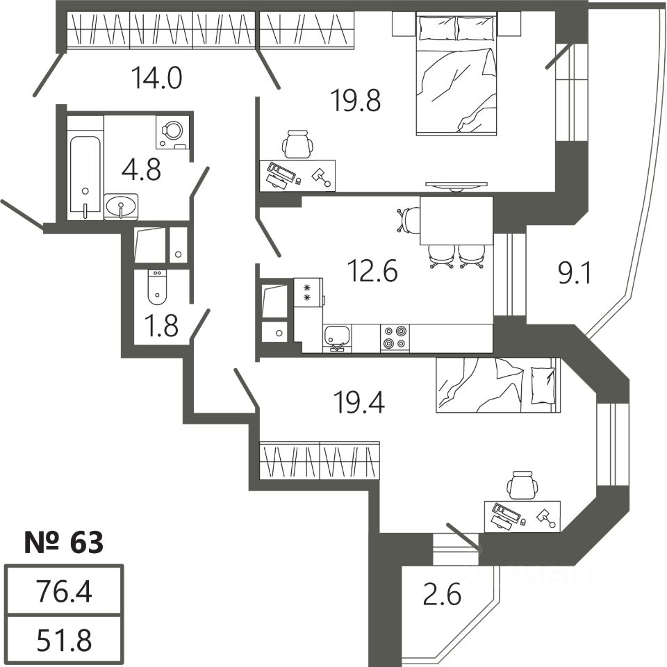 Общая площадь76,4 м²