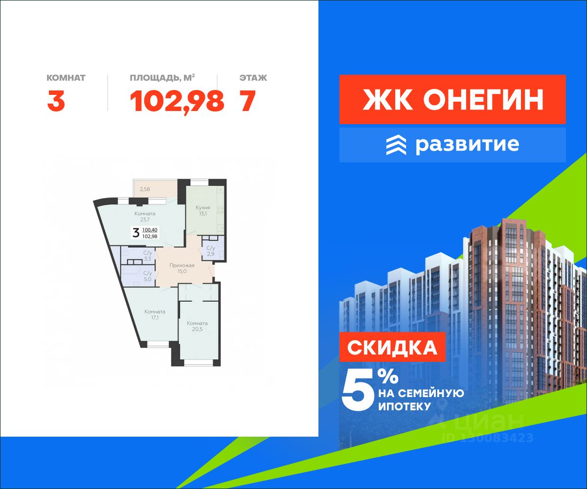 Продается квартира площадью 102.98 кв. м с отделкой White box. Квартира находится на 7 этаже 22 этажного дома, в новом жилом комплексе "Онегин", расположенном по адресу: Московская область, г. Подольск, ул. Садовая 3, корп. 1.