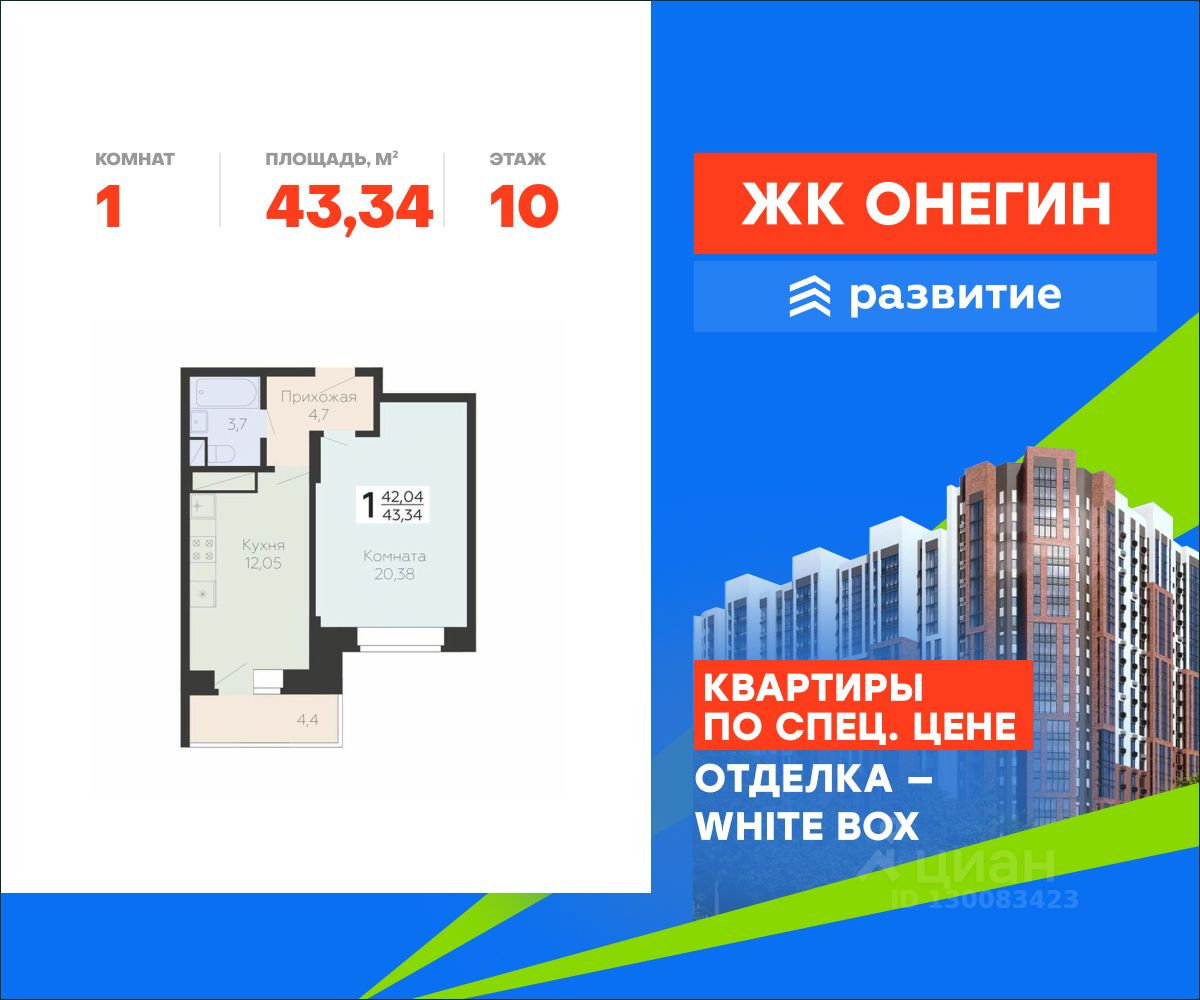 Продается квартира площадью 43.34 кв. м с отделкой White box. Квартира находится на 10 этаже 22 этажного дома, в новом жилом комплексе "Онегин", расположенном по адресу: Московская область, г. Подольск, ул. Садовая 3, корп. 1.