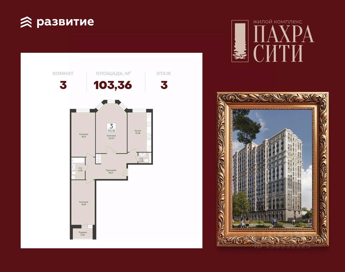 Продается 3-к квартира площадью 103.36 кв. м без отделки. Квартира находится на 3 этаже 24 этажного дома.