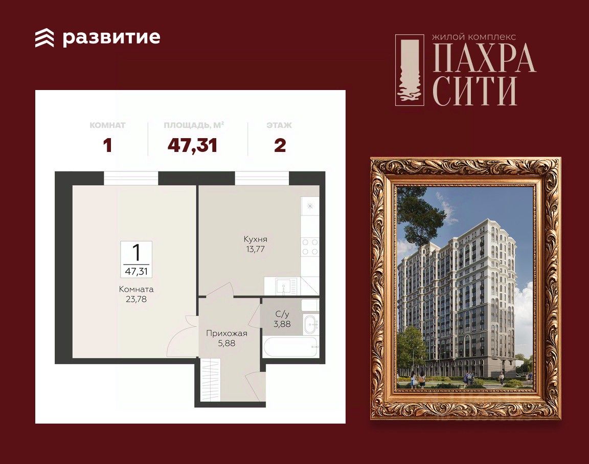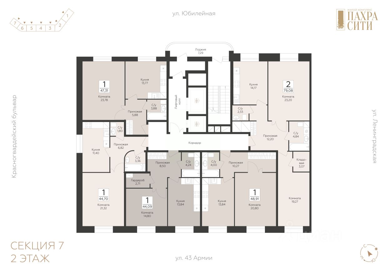 Продается 1-к квартира площадью 47.31 кв. м без отделки. Квартира находится на 2 этаже 24 этажного дома.