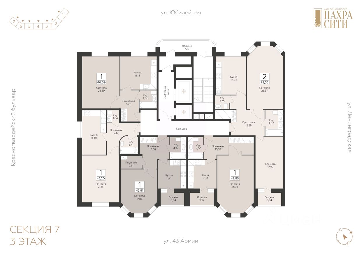 Продается 1-к квартира площадью 43.81 кв. м без отделки. Квартира находится на 3 этаже 24 этажного дома.
