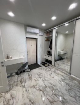 Интерьер квартиры выполнен в современном стиле. В квартире есть все необходимое для комфортной жизни: просторная кухня, светлая комната и совмещенный санузел. Дополнительное удобство создает наличие лоджии, где можно организовать зону отдыха или хранение вещей.