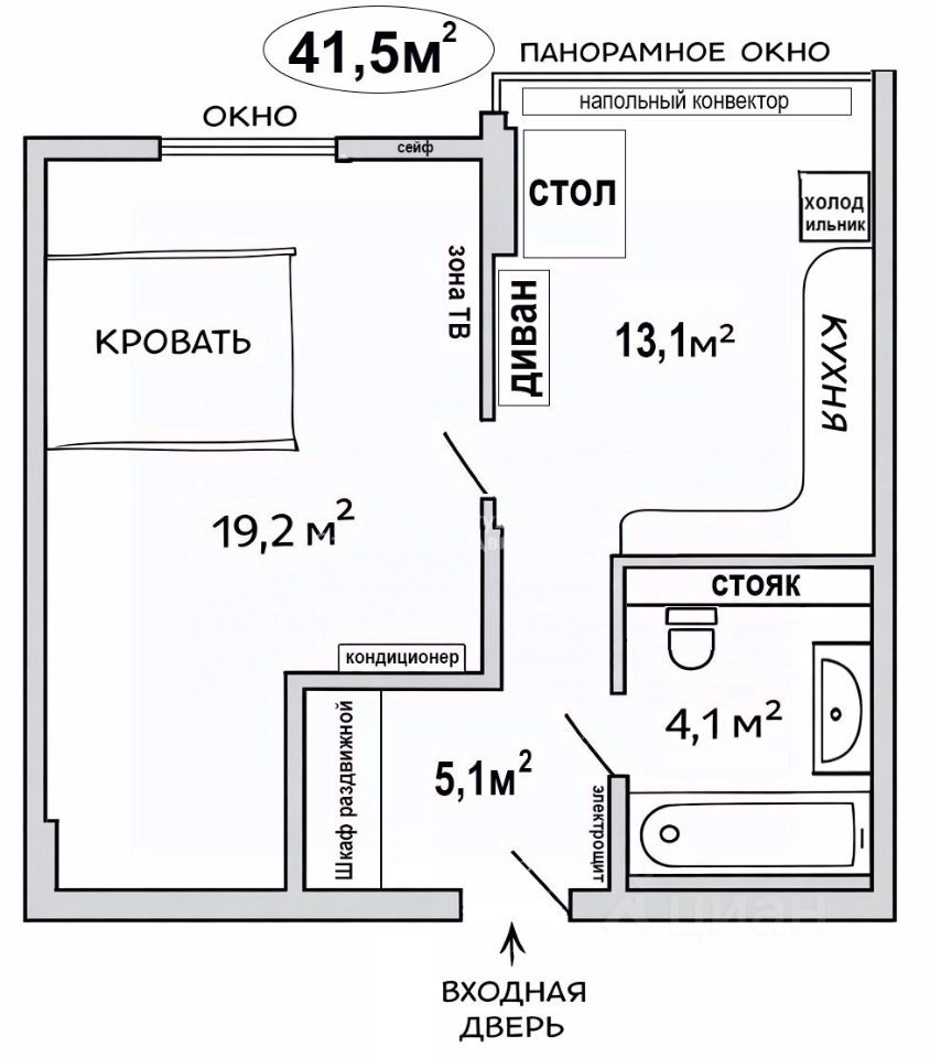 Общая площадь: 41.5 м²