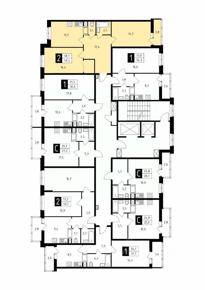 Продаётся 2-комнатная квартира в строящемся доме (Корпус 1), срок сдачи: 1-кв. 2026, общей площадью 59.50 кв.м., на 5 этаже.