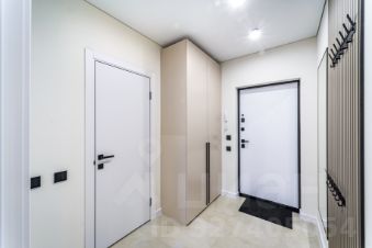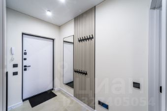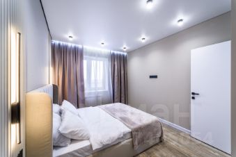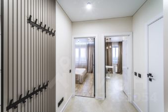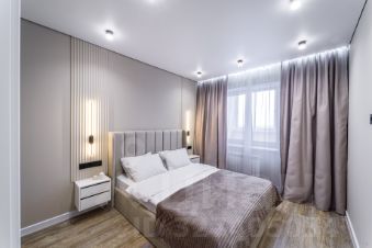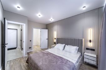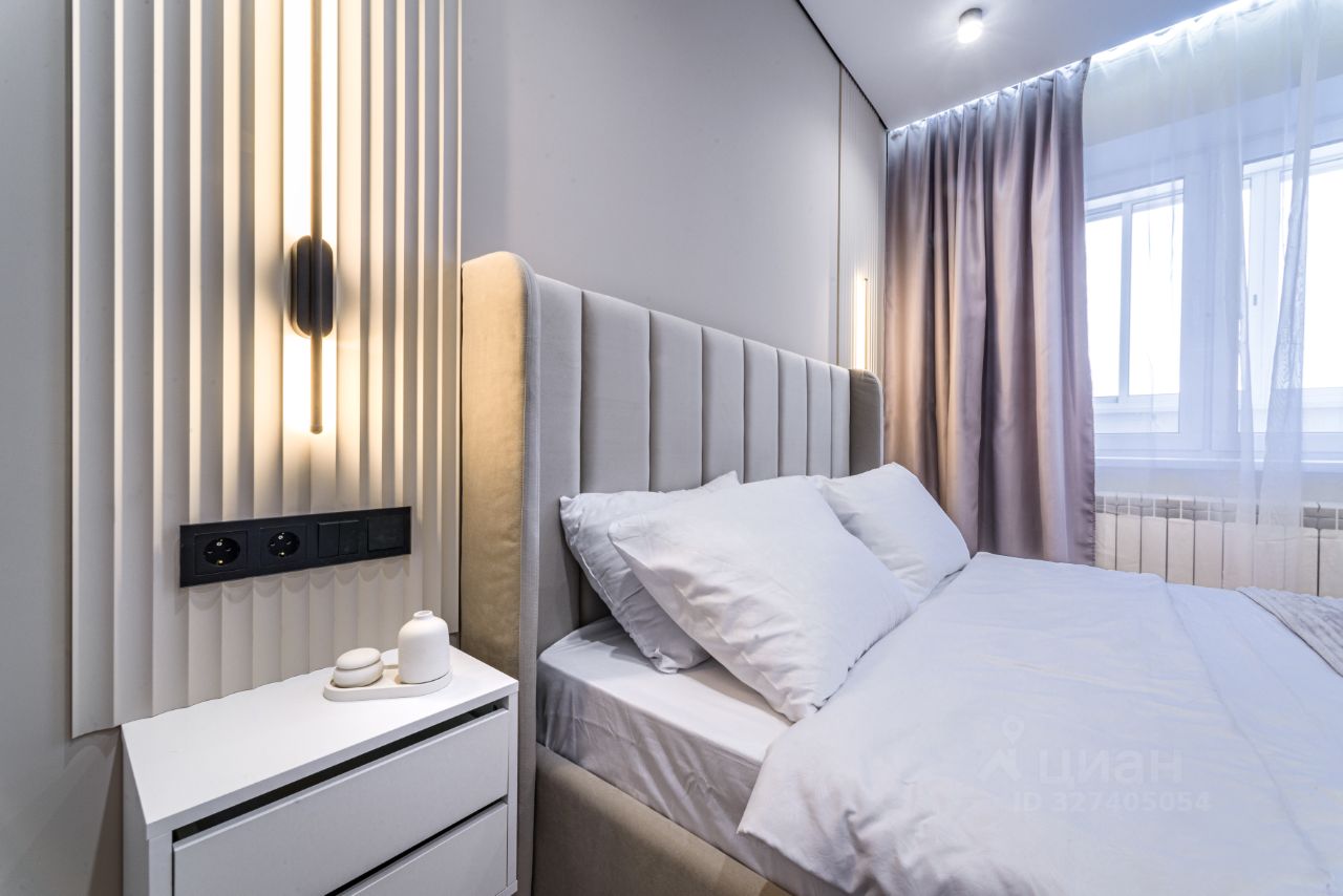 Мебель: шкаф в прихожей, в который спрятаны электрический щиток и индивидуальная регулировка отопления, кровать в спальне с красивыми прикроватными панелями и тумбами, скрытая подсветка штор.