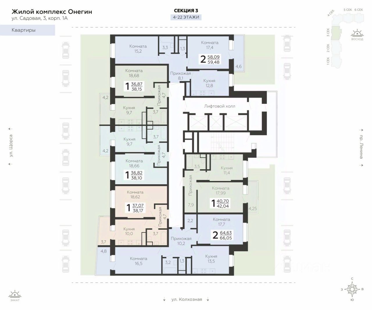 - 2 пассажирских лифта и 1 грузовой в каждом подъезде;