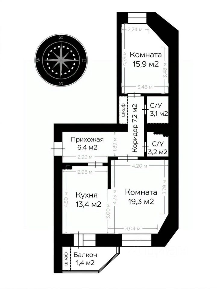 Планировка распашонка - это оптимальное решение для проживания, окна выходят на восток и запад.
