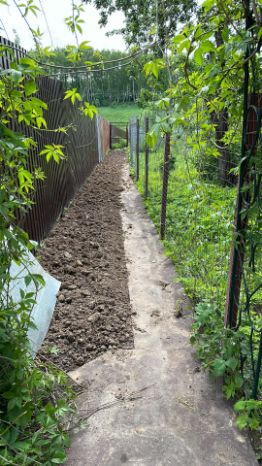 Участок огорожен глухим новым забором из профнастила и сеткой со стороны других соседей.