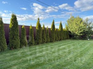 Участок ровный, сухой, правильной формы. По всему участку аккуратный газон, растут плодовые деревья: 2 груши, 3 яблони; а также прекрасные ухоженные 10 летние туи, ели, сосны, розовые кусты, гортензии.