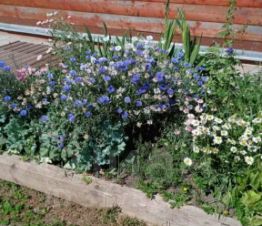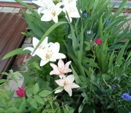 Так же на участке есть плодовые деревья (яблони, груша), ягодные кустарники (черная и красная смородина, крыжовник, малина), можжевельник, жасмин, многолетние цветы (розы, пионы, ирисы, лилии, лилейники, незабудки, дельфиниум, тюльпаны, примула) и др.