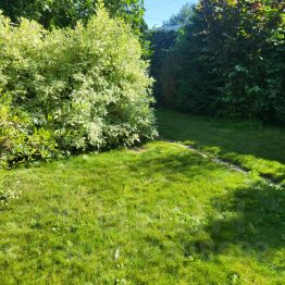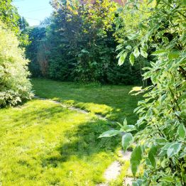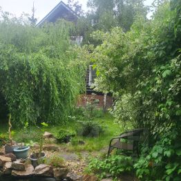 Участок, как и дом поделён пополам, разделительной линией служит густая посадка красивейших деревьев Другая половина это возделанный огород, высокие грядки, теплица и плодовые. А также оборудованная тёплая большая бытовка.