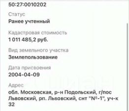 Продается участок по адресу: Московская область, Подольский район, г. П. Львовский, Снт 1, участок 32.