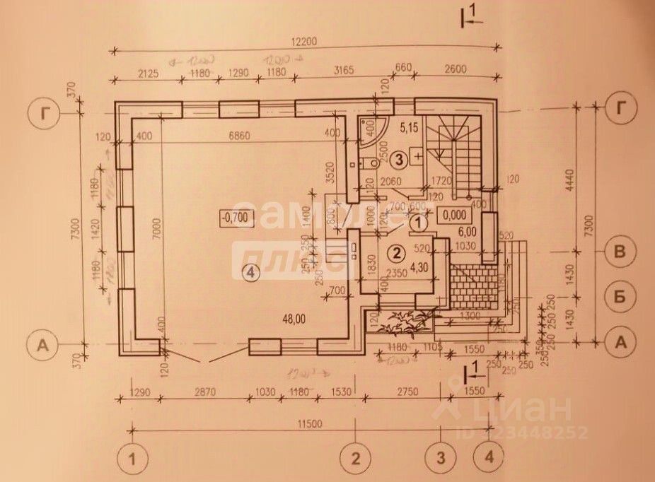 На участке находятся выделенная часть жилого дома площадью 44 кв.м. с централизованными коммуникациями (свет, вода, газ), а также двухэтажное кирпичное строение без отделки общей площадью 125 кв.м. На первом этаже планировали: прихожую, боллерную, санузел, кухню-гостинную, комнату. На втором этаже: санузел, каминный зал с выходом на балкон и две спальных комнаты. Подразумевалось, что это будет новый жилой дом.