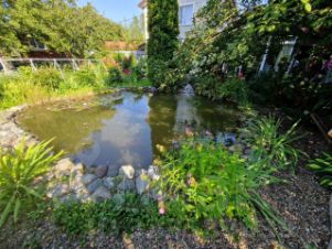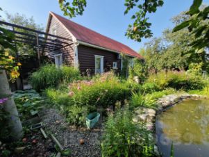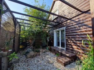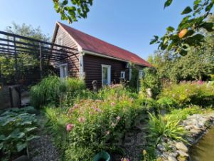 Ухоженный сад, в котором стоит щитовой домик размером 40 кв.м. (может быть оборудован в отдельное жилое помещение, в нём 3 комнаты). Пруд с альпийской горкой и водопадом, недалеко от него мангальная площадка с коваными лавками и столом.
