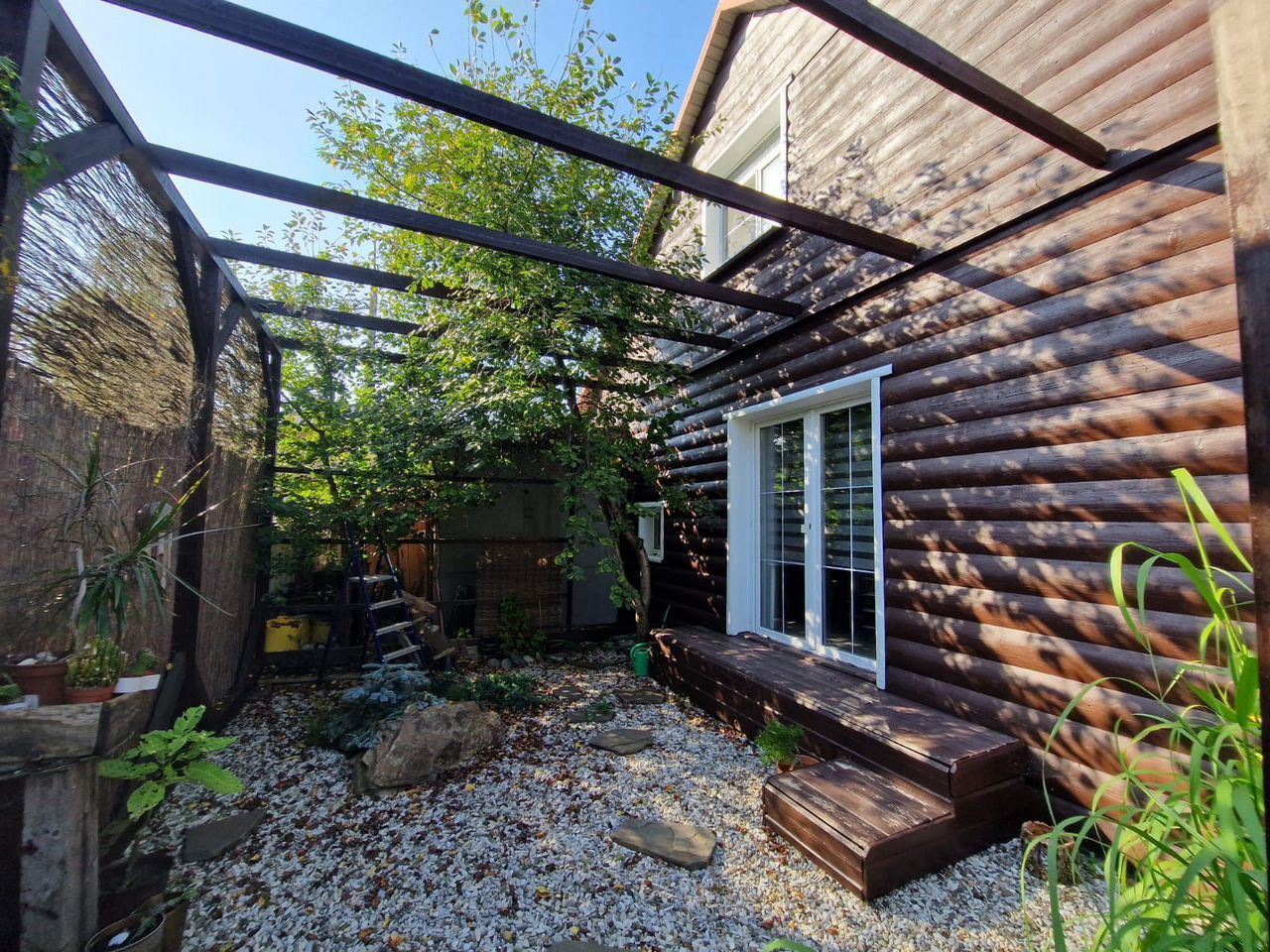 На одной половине дома на 1-м этаже кухня, большая ванная с теплым полом и выходом в сад, гостиная с панорамными окнами в японский садик. В мансардном этаже большая спальня, под лестницей удобная кладовка для сезонных вещей.