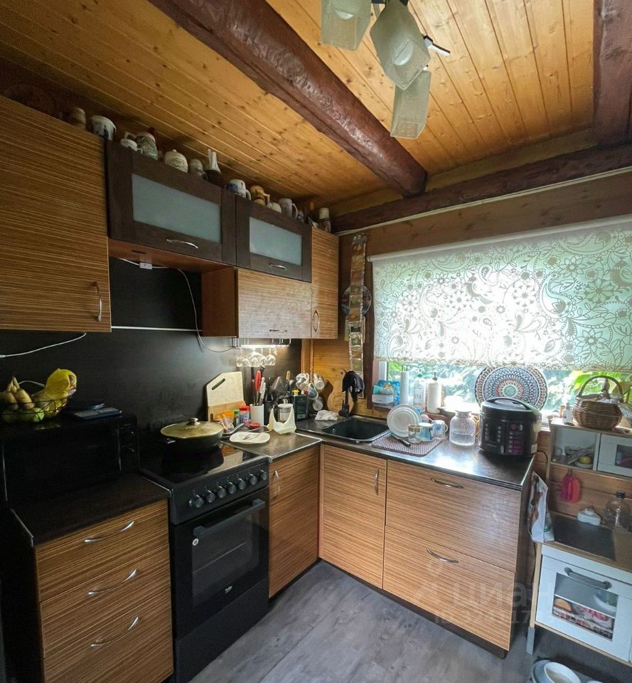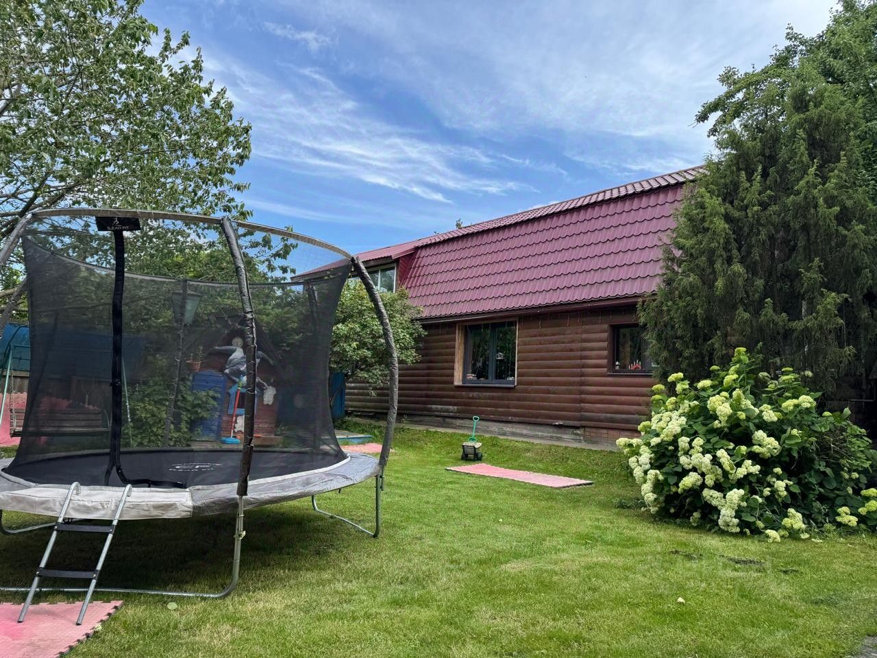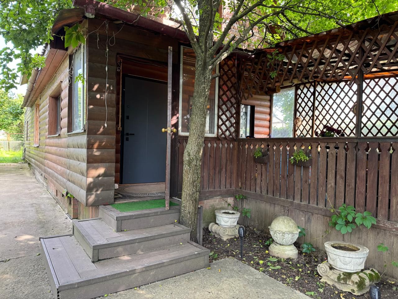 Дом построен из сруба и пеноблоков, обшитый блок-хаусом.